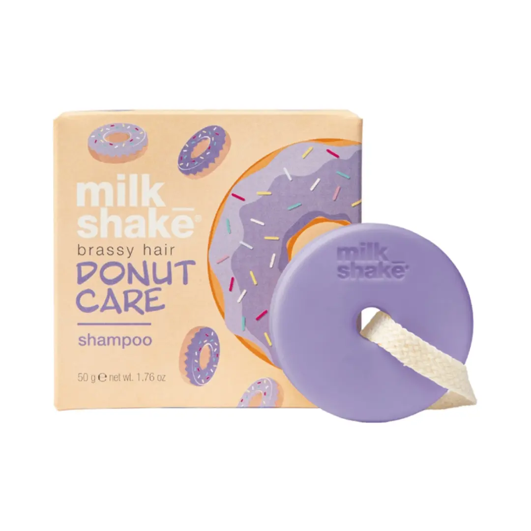 Milk_shake Donut Care Kein gelbes Shampoo für messingfarbenes Haar ist ein festes neutralisierendes Shampoo, das hilft, Gelbtöne in hellem, blondem oder grauem Haar zu beseitigen.